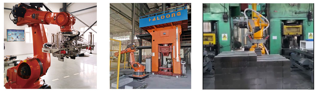 根據制品形狀尺寸設計專用夾具,采用機器人取磚碼垛工作效率高,動作精準統一,24小時工作無疲勞。(機器人選型根據負載和使用要求來選型)